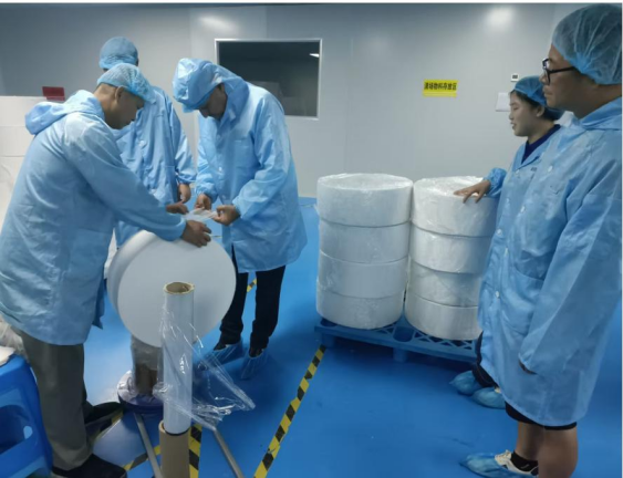 Cieľom tejto výrobnej inšpekcie bolo poskytnúť zákazníkovi komplexné pochopenie našich výrobných možností a systému riadenia kvality. V sprievode našich kolegov si zákazník prezrel dielňu na výrobu gázových roliek na prvom poschodí a dielňu na skladanie a balenie gázových plátov na druhom poschodí so zameraním na pozorovanie procesu rezania objednaných tortových roliek. Zákazník vyjadril veľkú pochvalu pre naše stabilné a štandardizované výrobné prostredie a obzvlášť sa zaujímal o zvlhčovací systém inštalovaný na udržanie stabilného prostredia.